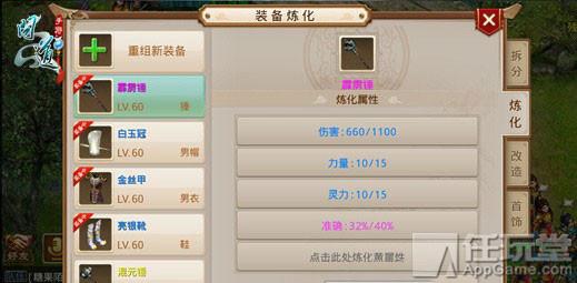 完成装备重组之后,60 级以上的装备可进行装备炼化,装备炼化的目的是让装备出现其他附加属性。装备属性炼化需要消耗相应属性颜色的超级水晶(比如粉属性炼化需要消耗超级粉水晶),炼化之后可查看相应属性是否是自己所希望的,如若不是,重新炼化即可。
