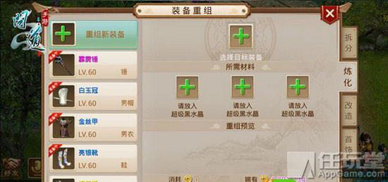 材料准备好后就是对装备重组了,装备重组可以将上一步骤中超级黑水晶中的属性附加到想要合成的目标装备,每次重组需要投入 3 颗与目标装备同等级同部位且不同属性的超级黑水晶。重组后会生成带有 3 颗超级黑水晶属性的目标装备,属性为蓝属性,装备为蓝装备,值得一提的是重组是必定成功的。