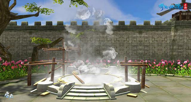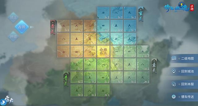 跨服城战玩法开启后,帮会需要建筑【灵飞镜】将帮众传送至三十六洞天中。在该场景中,玩家要以帮会为单位,占领、抢夺地块,并建造城池。同时还有真武、押镖等任务可以获得大量经验、帮贡以及领土名望奖励。