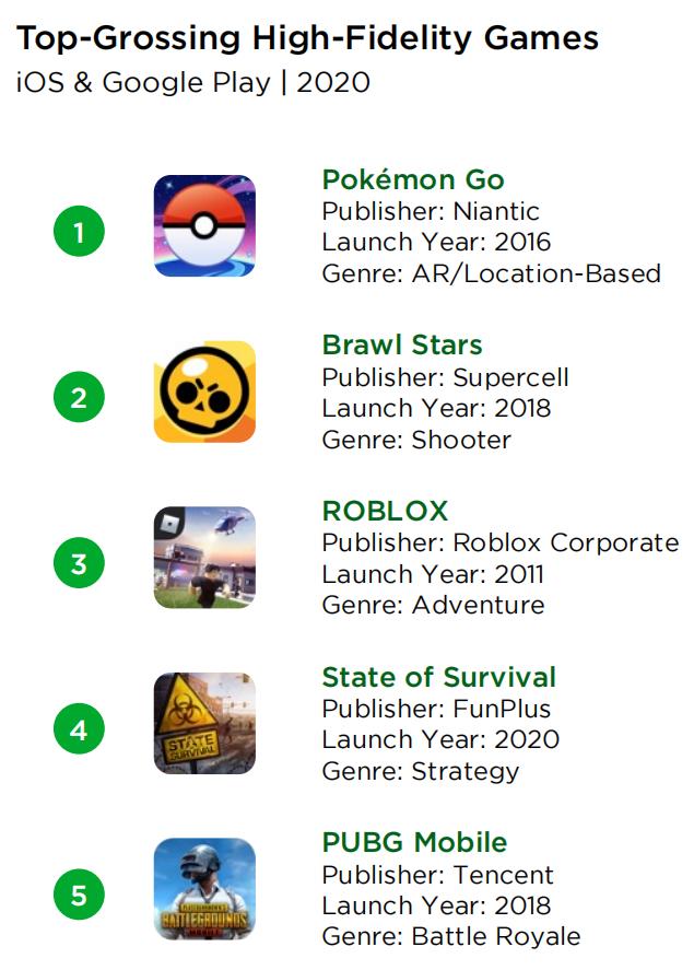 这四年间,高端手游收入占比的大幅提升,主要得益于跻入榜单头部的高端手游。报告显示,2020年,北美市场收入前五的高端手游分别是:《Roblox》、《Pokemon Go》、《PUBG Mobile》、《使命召唤手游》以及《万国觉醒》。就收入榜Top 10而言,有3款为高端手游。