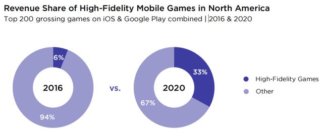 据Newzoo和arm联合发布的《下一代手游报告》(以下简称“报告”)显示,2020年,在北美Top 200畅销榜游戏中,高端手游数达到48款,贡献收入占比33%,而2016年,仅有23款高端手游入榜,收入占比仅有6%。