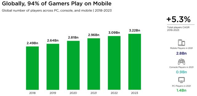 报告显示,2021年全球玩家数预计有29.6亿,其中玩手游的用户达到28亿,玩主机游戏的用户9亿,以及玩PC游戏的用户有14亿。