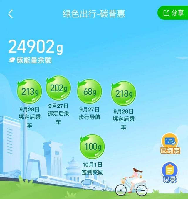 用户刷绑定后的北京一卡通,乘坐公交、地铁出行系统将在 2 天后自动生成碳能量球,大家可在 7 天内领取,碳能量可在 高德地图、百度地图 APP 中兑换 北京一卡通充值码或 爱奇艺会员、百度网盘会员等优惠,也可用于 植树、修桥等公益项目。
