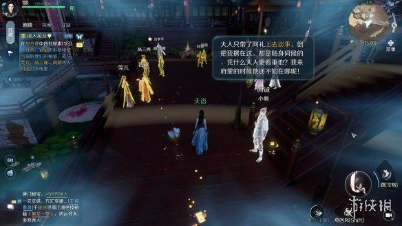 望气状态下的我们,能提升自己的感官,注意到一些原本注意不到的互动,比如这些黄色单位,都是可以继续对话从而拓展剧情的——而通过右侧被我们听去碎碎念的这位小厮,我们也能在楼上得知,今晚这甜水巷,有什么大事将要发生。