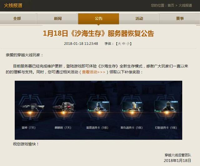 1月18日,在2018年的《沙海生存》新模式也引来了首次的更新,在这一次的更新之后游戏更是增加了“新春主题永久武器上线”,这一次的游戏更新更是带来了很多不同的玩法,再一次的丰富了《穿越火线》战术竞技模式“沙海生存”的新地图。