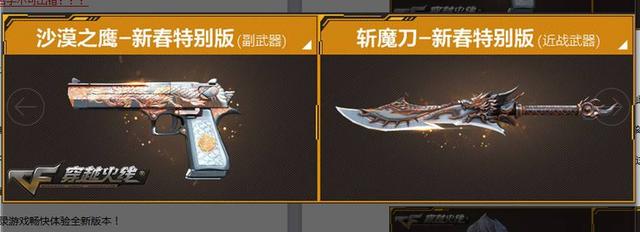 在《穿越火线》正式开启全新的战术竞技模式“沙海生存”的“新春主题”上,这一次更新的永久武器上线沙漠之鹰以及新春特别版和斩魔刀-新春特别版(近战武器),同时,更新的武器不仅仅只有这两款,在《穿越火线》中另有AK47-苍龙、乌兹双枪-霓虹等22款期限武器、道具同步上架。如此丰富的武器系统更是给了玩家不一样的享受!