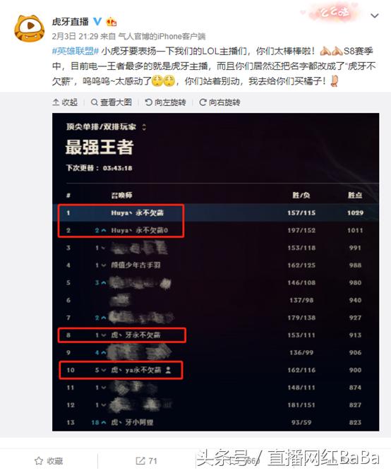 最近虎牙的官微又发虎牙电信一区的王者主播名单,发现虎牙主播集体改名“虎牙永不欠薪”,并表示会表扬LOL的主播们。