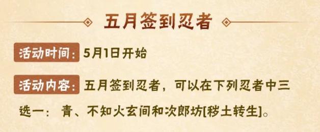 《火影忍者》手游在五月签到礼中给玩家准备了三位强力C忍,他们分别是青、不知火玄间和秽土次郎坊。