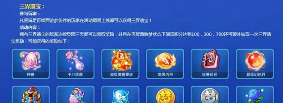 【三界遗宝】:2018年5月1日-31日期间,人物等级≥50级,且回归之前的最后一次登录时间在5月2日24点前的玩家,只要在5月9日-31日期间上线,即可获得三界遗宝。拥有三界遗宝的玩家连续登录游戏三天,均可领取丰厚奖励,而在再续西游梦状态下回流积分达到100、300和700分时,还可额外抽取一次遗宝奖励哦!奖励具体包括奇异的彩果,萌新冒泡框、永久头饰等,更有神兽灵石、千叶莲露、高级魔兽要诀、高级内丹、炼兽珍经、超级幻色丹等你抽取。