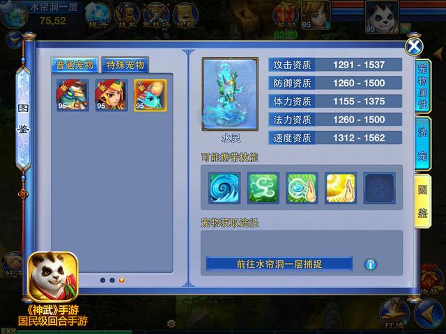 神武手游全新内容“王者荣耀”火热开启,本次版本上线了全新的副本、地图和宠物,内容之丰富让人惊喜,继续稳坐回合制王者手游宝座。本次更新有三大宠物,龙虾骑士、深渊海马和水灵,造型华丽资质强劲想必许多玩家都迫不及待要入手一个。本次就让小编详细介绍一下三大新宠之一的女性宠物——水灵。灵如其名资质惊人 水灵是王者荣耀三大95级宠物中唯一的女性形象宠物。全身由水元素组成的飘逸形态,一身蓝绿色的水纹时刻透出充盈的灵气。灵力澎湃的水灵拥有着傲人的资质属性,除了体力资质以外,其余四项资质上限都惊人地突破了1500点,虽然不像另外两只宠物一样某一属性极端突出,但是均衡而强大的三围却使得水灵就像水一样有着超强的可塑性。