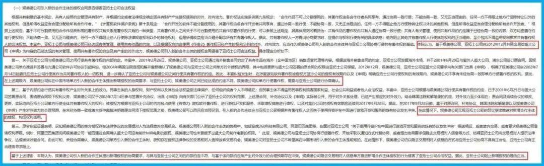通过对判决理由分析可以了解到,法院认定娱美德的行为已经侵害了亚拓士的合法权益——在双方已有行使共有著作权的内部约定的前提下,娱美德拟单方行使著作权在中国市场单方引入新的合作主体,与亚拓士达成的约定不符。且在未经协商一致的情况下,娱美德依然无视亚拓士的异议继续推进对新增合作主体授权,构成了权利滥用。