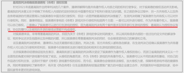 这需要我们了解(2020)最高法知民终395号民事判决书的详细情况,该案的原告为传奇IP共有著作权人之一的亚拓士,被告为另一位传奇IP共有著作权人娱美德以及和娱美德签约拿到《传奇2》授权开发运营《新传奇H5》游戏的上海游光。
