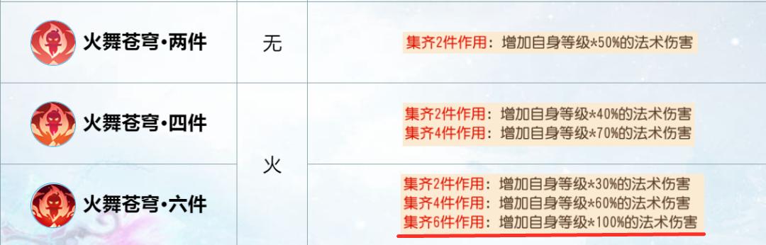 "火舞苍穹"是一套适合法系使用的套装,它主要用来提升"法伤"。从截图可以看到,如果集齐6件可以触发如下效果:增加自身等级*100%的法术伤害。如果只是单纯地看概念,很难明白它的厉害之处,只有换算成具体数字,才能够明白它的强大。将六件火舞苍穹分别给予精锐、勇武与神威,那么就可以增加69、89、115点法术伤害,看到这里,相信各位玩家能够明白套装的重要性。