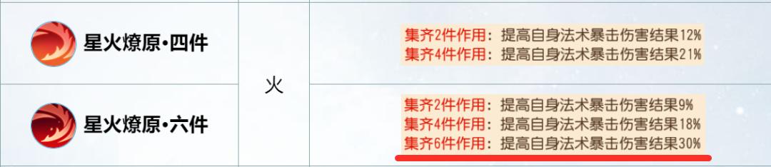 除了可以增加法伤,"星火燎原"则针对法术暴击能力进行了优化。在六件套装效果下,可以提升自身法术暴击伤害结果30%。这一效果与超级泡泡的专属内丹"会心击"有些相似,具有较强的实用性。星火燎原提升的是法爆部分的伤害,从这个角度出发,门派特性最好是法爆,而魔王就非常适合。