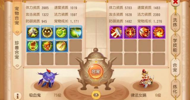 副宠方面,楼主选择了一只律法女娲,这只宝宝已经洗出了4技能,同时还带有善恶有报特殊技能加持,而在资质方面,这只律法女娲的表现也不错,攻击资质1628,防御资质1482,体力资质5703,三项都非常接近属性满值,再加上1.276的高成长值,用来与吸血鬼合宠可谓是最合适不过了。