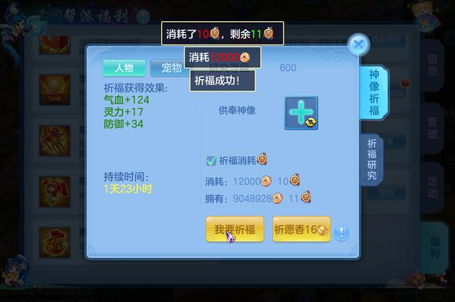 帮派祈福也是战前准备中非常重要的一部分,主要分为人物和宠物两种祈福。其中人物祈福中还有机会获得特殊效果,包括"修炼功法+1""封印成功率提升"等效果,而且这个祈福本身所花费的帮贡也比较少,一次祈福也可以持续两天时间,对我们的战斗力的提升不可谓不大。