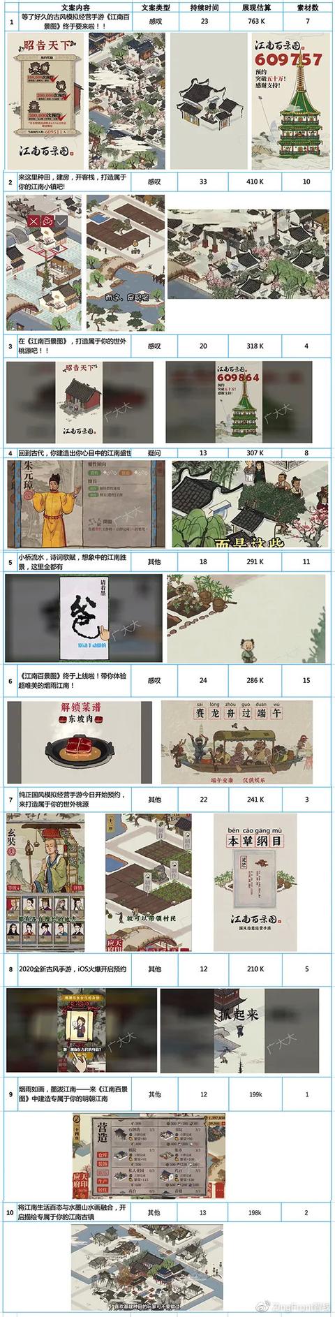 从广大大后台抓取到的热门文案来看,整体上《江南百景图》的投放比较注重文案调性与手游风格的一致性,“立即下载”、“快来玩”等在其他手游常见的号召文案在这里基本找不到,古风、世外桃源、江南胜景等是其广告文案的高频词汇。