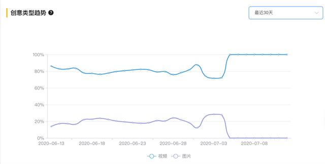 相应地,通过查看创意分析板块,《江南百景图》在过去42天投放的数千条广告素材中,图片创意与视频创意的比值是2:8。在前期的游戏内测阶段,从图片类创意到慢慢加大视频创意比例,《江南百景图》的创意类型基本稳定。在7月2日上线之后,视频类素材的投放更加大力度,毕竟是一款古风风格的手游,在画面与音乐的结合下才能更好展示其内在韵味。