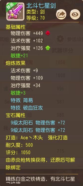 764的物理攻击再加上2颗13级太阳石,使这把武器的物理伤害几乎接近1000点。而在保证输出的前提下,40点的体质加成,又可以保障这把武器的主人拥有更强的生存能力。