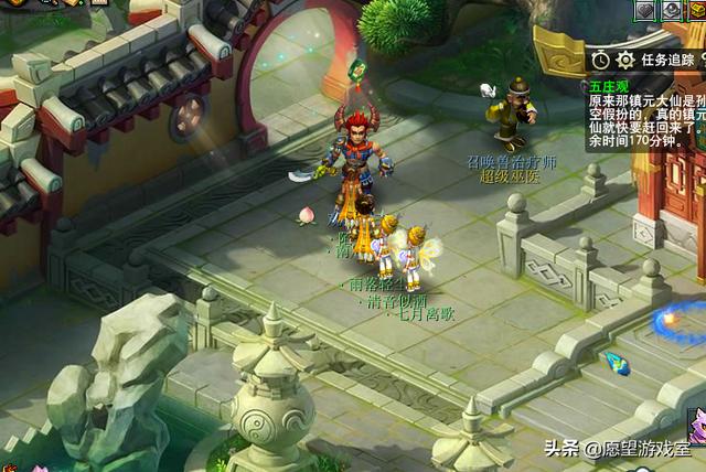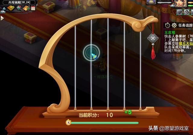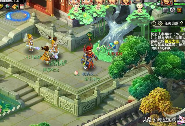 做完30个任务,点击观音旁边的青莲圣女传送到五庄观找镇元大仙做第七环任务,抓人参果,这环就跟师门任务的乾坤袋一样,一共10个。