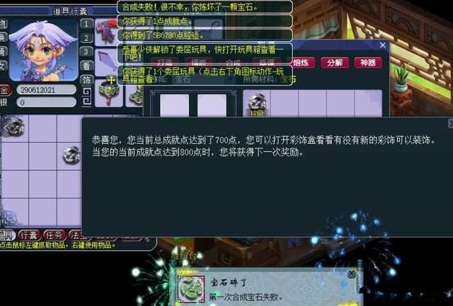上面的这位玩家是在合成宝石的时候获得一点成就,但是这点成就就是合成宝石失败,而且看这位玩家道具栏里的宝石等级,应该是12级冲刺13级的时候合成失败了,所以就损失了一块12级黑宝石,他的小编服务器的价格损失一块12级的黑宝石,大约是损失了2500块钱,但是上面的这个角色确实又来合宝石的小号,这种小号获得这个成就是没有任何意义的。