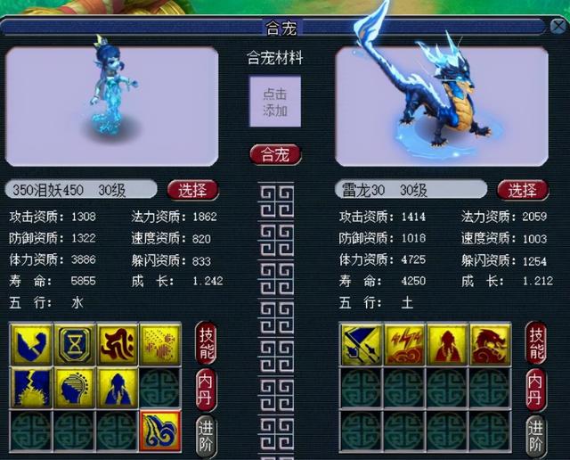 上面这组炼妖的野心是比较大的,因为他用了一只七个技能拥有须弥真言的泪妖,另外一只是四个技能拥有的出其不意和风起龙游的雷龙,这位玩家想要获得的就是那种同时拥有的出其不意、须弥真言和风起龙游三个真是特殊技能的雷龙,而且技能数量还很多,这组炼妖能够合出来的雷龙的技能数量上限能够达到11个。