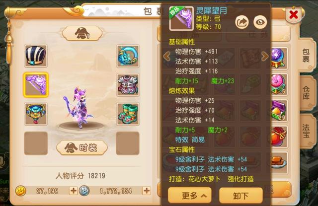 接着我们来细细品看,武器是一把70级的简易弓,大家都知道卡69的玩家最需要的就是70级的简易装备了,不仅仅是因为基础属性高,更因为70级的武器可以打更高等级的宝石,这把弓的基础属性虽然没有拉满,但是也算中等偏上了,绿字是耐力和魔力,还是挺适合号主的,所以这把武器灵儿觉得是非常不错的。