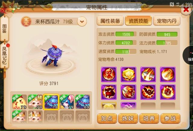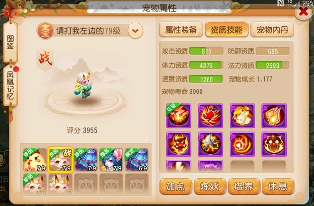 许多小伙伴都是到如果是零元党,那么卡69应该是玩的最舒服的等级,这位小伙伴显然也是这么觉得的,先看看面板属性,气血4005,物防957,法防829速度637,总的来说还是不错的。
