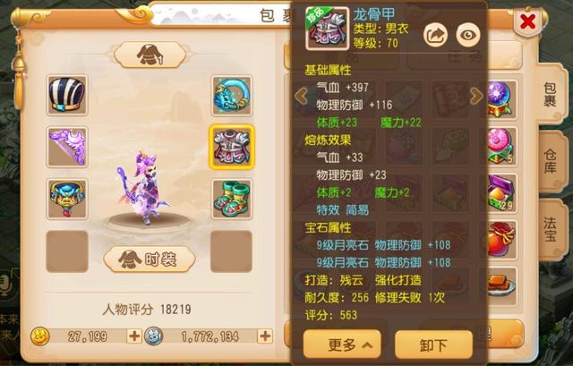 再看看他的另一件简易装,70级的男衣,气血397属于中等偏上的数值,而绿字是体质和魔力双加22以上,非常棒。和大多数人一样,号主的两件简易分别是武器和衣服,并不是说其他部位的简易不重要,而是其他部位简易和其他特效可能要做个取舍,就拿腰带来说,腰带是唯一会出愤怒特效的装备,而愤怒和简易都属于特效,不能同时存在,所以腰带选择愤怒还是简易也让一批小伙伴非常纠结,不过拥有大特技的门派应该都会选择愤怒,毕竟消耗愤怒值减少可不是开玩笑的。