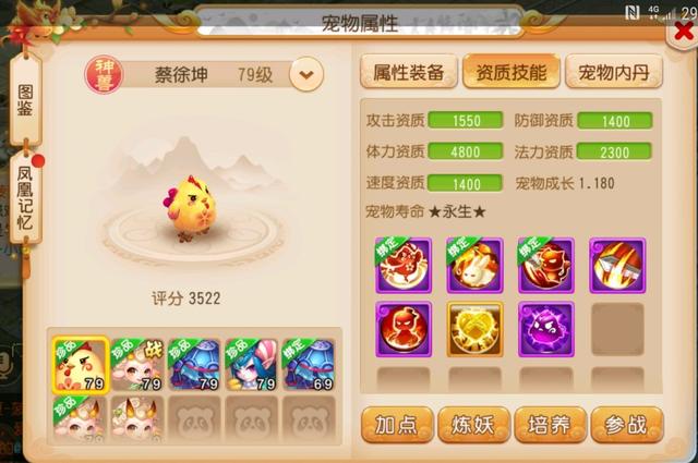 最后看看这只超级神鸡,作为神兽,必带五个技能,而且凤舞这个技能非常强力,属于叠buff技能,随着疾风的叠加可以提高自己的速度,并且叠到3层以后可以额外攻击防御最低的另外2个目标,群攻神技,号主打书选择了高级隐身加高级连击的打法,打高级隐身提高了自己的存活能力,毕竟在PVP中这种AOE伤害宠物很容易成为对面集火的目标。