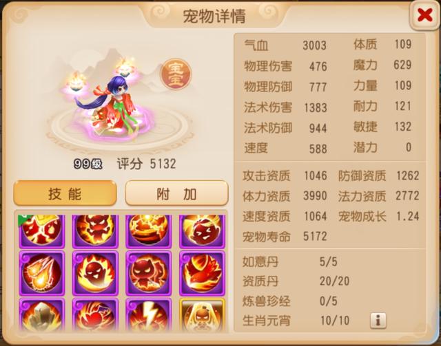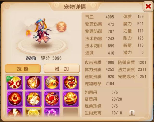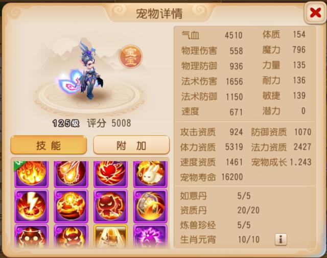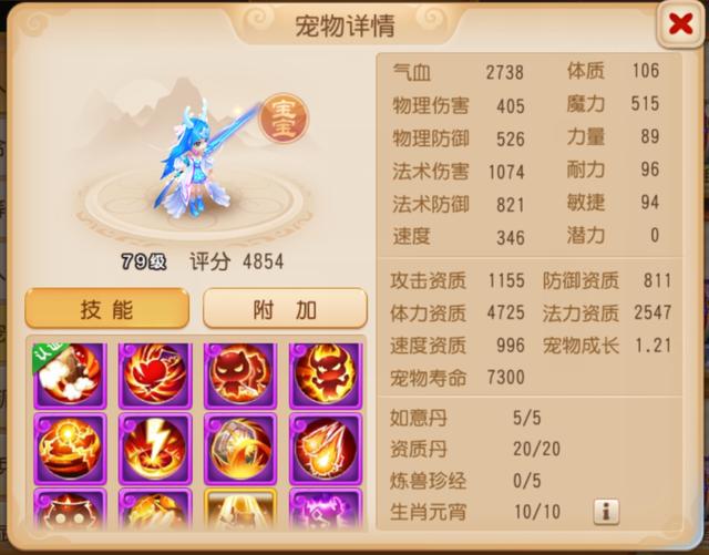 这只10技能龙女,4725体资、2547法资,1.21的成长,整体属性十分优秀。并且,技能数还多达10个,称得上精锐的毕业级法宠了~