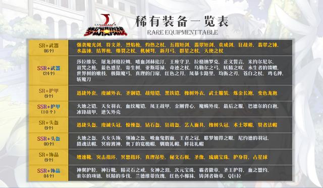 从图中可以看出,在多达120多件SSR装备面前,这些稀有的SSR装备仅占据了很小的一部分。而且同抽英雄相同,在获取每件装备前都是有概率存在的,因此很多人即便从开服就开始玩也没有见到最后之服、范围剑等更是司空见惯的一件事。尤其是这其中,基本上涵盖了大部分目前已存的饰品,珍稀程度可见一斑。
