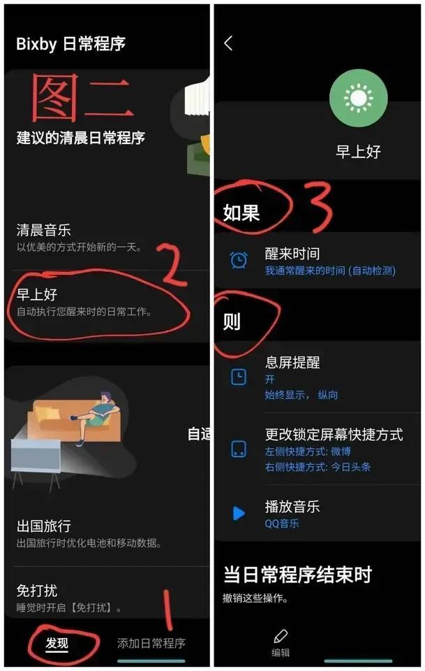 打开Bixby日常程序之后,在发现页面可以看到三星自带预设的几个自动化流程(图2),不过,每个人的生活习惯都不太一样,所以我们需要根据实际情况创建符合自己实际需求的日常程序。