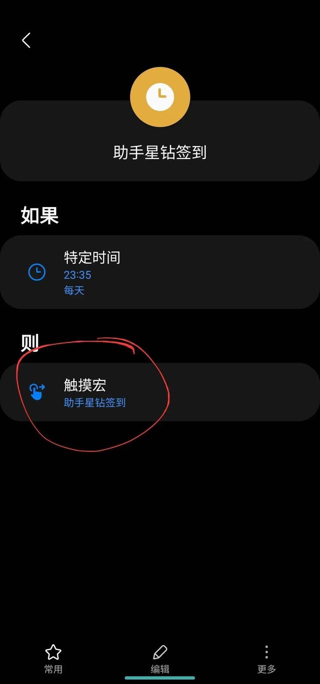 Bixby日常程序基本覆盖了常见的使用场景和触发条件,各种功能应有尽有。“如果”观看电子书时“则”进入护眼模式;“如果”手机到达或离开公司时“则”自动打开钉钉提示打卡等;“如果”到了夜晚时手机“则”自动帮我们操作星钻签到、京豆签到。要注意!!!这里就需要到强大的触摸宏了。