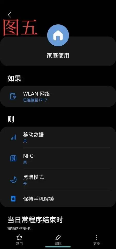 简单例子:如果“连接家庭WiFi”则“移动数据关、保持手机解锁、黑暗模式开”(图5)