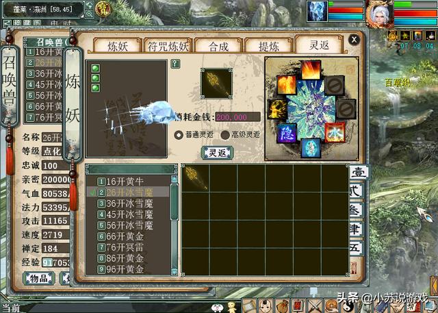 每次修炼都是需要灵藤的,那灵藤怎么来呢?在这个系统里还有一个新鲜玩法,叫“灵返”,一句话概括,这个灵返就是原有的召唤兽技能提炼的新玩法,只不过召唤兽技能提炼如果不成功宝宝会消失,但这个灵返无论成不成功,原来的召唤兽都不会消失。换句话说,这个新的“灵返”玩法就是允许你把不需要的技能敲出来变成灵藤,然后用来修炼。