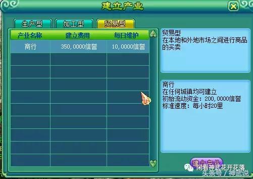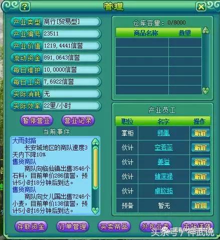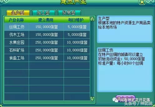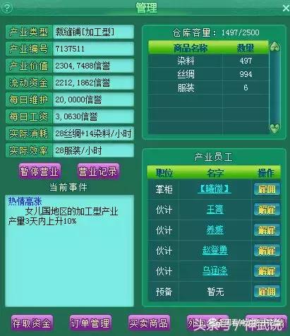 我最擅长也最喜欢的产业类型就是商行,但是商行的建立需要有一定的资本,对于新手来说,不建议一开始就直接开商行,不会调配还有一定保留资本,一旦不会操作亏损了,就真的是赔了夫人又折兵了,如果你想简单操作又每天有稳定的收入,生产类是不错的选择。先来讲生产类型(员工技能也在这里解析,所以生产类请认真看完)