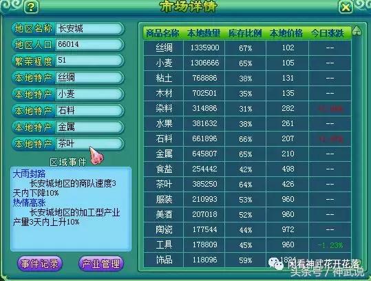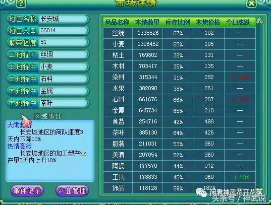 出色的投资者要学会自己寻找商机,每天不能只买进卖出固定的,物以稀为贵,买进卖出固定东西,久而久之同类商品积聚贬值,不利于长期的盈利,所以要运作好商行,不仅仅要会找商品差价,参考自己工商技能计算出买进卖出商品数量,还要关注市场行情变动。 工商业系统还是比较结合实际的,有时突发事件的发生正是有利商机的来临,点击市场详情,左下角有个事件记录,里面有时会出现商品价格变动的时间,这样你就可以参考自己情况进行选择,某个城镇某商品大降价,适合买进,赚的或许会不少,某个城镇商品稀少涨价,这样又可以设计卖出以盈利。具体怎样利用特殊事件盈利还有哪些注意事项在之后会提及。