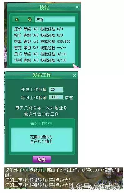 至于打工,建议自己多开三四个角色弄生产型或者加工型产业给自己打工,前提是你的其他角色有至少300W底子的资金才可以开始给你自己号打工。 估计你们也会问为什么,给别人打工要被宰,给自己打工就是任性,你们花一样的体力,别人给你工作打工个20次,能赚个4W信誉已经算好人了,但是你给自己号打工,花费最少的体力值做最简单的工作20次都能赚6W,最低规模的丝绸作坊,发布工作一次花费体力20点,每次工资3000信誉。到了铁匠铺那类规模的,一次打工花费体力要45体力,每次的工资是6000信誉,总共就是12W的信誉。当然了,既然想任性就要有任性的资本,这就是我为什么说其他号要有300W信誉的底子,就是能保持稳定的让你自己给自己打工,并且能让自己赚的信誉最大化。 上面只是其中一方面,另一方面就是你以后打工就不用到处找谁给的工资多,也不用顾虑体力选择工作,而且打工技能也不是白给你练的。 打工技能有2个,一个就是帮助你打工减少体力消耗,另外一个就是让你打工获得的工资更高。这里就废话少说,直接给你们看个例子的数据你们就明白了。 打工技能为0J的时候,自己给自己发个工作,实际获得信誉这么多