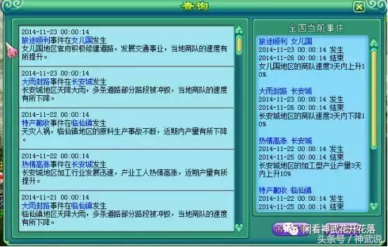 还有个类特殊事件要注意。这种特殊事件属于突发型。包含2种: 第一种就是一个小时内异地买进物品有优惠,降价10%,算上你经商的降价能力有15%,那样来说你买进物品的价格只是原来物品价格的75%,也就是说你原来买进物品再到本地卖出你能卖差不多100W,但是有这个加成,你异地买进一批货物到本地卖出就能卖110多W的信誉,只要你合理分配空间,保证3批货到的时候不会超出容量,你这一天3个商队能为你创造的利润最高就是70多W的信誉了,当然了,现在各城镇的物品价格差距不是很大,一天能有差不多65W赚已经很不错了。 第二种就是一个小时内卖出物品到异地有抬价BUFF,再提价10%。这个特殊事件其实差不多算是一无是处,除非刚好发生在你的货物快要到达异地城市卖出的那一个小时之前内出现这个BUFF,这种状况发生的几率可以跟买彩票差不多了,随机性太大,发生的几率其实也很低。 当出现一个小时的突发事件的时候,异地买进降价优惠可以赶紧利用,好好在那一个小时内制定好你要买的东西,,你那一天赚的信誉绝对会比平时要多得多。 但如果说出现一个小时内异地卖出抬价10%的时候,你就不能再选择异地卖出物品了,单纯看那里的数据,你会以为你只要花70多W就可以卖100W,但是你送达的时候那1个小时已经早早的过去了,你卖过去的时候你并不会享受到那个抬价的BUFF,你最终收回的信誉也就最多只有90多W。直白的说就是当你选择卖出物品的时候出现这种事件,那一个小时你就绝对绝对不能选择卖出物品。