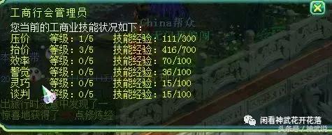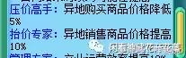 对于刚开始玩商行的玩家来说,压价、抬价的大师级(增益为15%,是正常情况下的最高值)技能是很好的助推器。