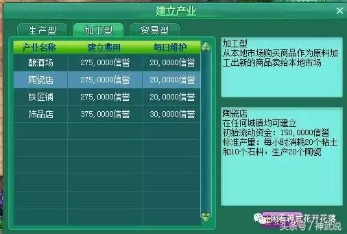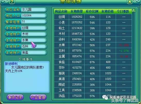 可以看见本地产业的特产都很便宜而且越小规模产出的产品的价格越便宜。关于产业转型只要留意一点,那就是同类型产业不能转移地区建立,就比方说说如果你在女儿国建立的丝绸作坊,就不能转型的时候选择在长安建立丝绸作坊(能建立丝绸作坊的只有长安和女儿国),当然了,你如果选择要转型在长安建立,那里也不会出现丝绸作坊的选项给你。现在神武产业转型有了个限制,就是同类型产业换地区不能转型,就是说你在女儿国建立丝绸工坊,你要转移到长安城的时候,转移产业那里不会出现丝绸工坊的选项,你只能转换成非丝绸工坊的产业。