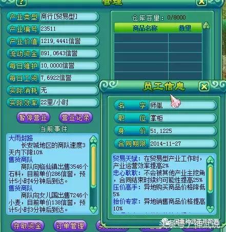 这个是对于生产类型比较有利的技能,但是管理技能还有风险控制(这个技能也就看脸,感觉可有可无)这两个技能只有掌柜才会拥有,其他的掌柜还有伙计都可以有,这些就是影响你产业产量的决定因素,加成越多,每小时产量越多,但是要给予的工资可能也会更多,至于员工技能怎样影响身价从而影响你的每日工资,下面对于员工技能的讲解会说清楚