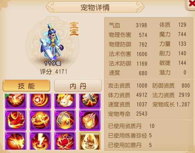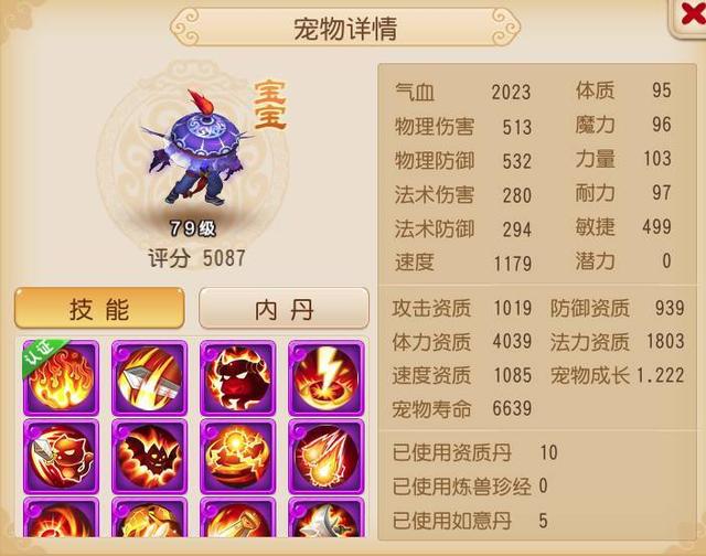 第二只是拥有10个高级技能的布雨神君。梦幻手游合宠是获取多技能宠物的唯一方式,但合宠会影响宠物的资质和成长。不过各位可以看看这只布雨神君,它在拥有10技能的同时,还能保证1.287的高成长值。虽然有5本炼兽真经的支持,但5本真经能加0.01的成长值,说明这只布雨神君的初始成长在1.286左右,这在合成宠物中是非常少见的。