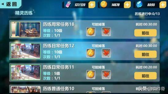 当然精灵所需要的升级材料也是可以在游戏中获取的,精灵有精灵历练副本,历练分为普通任务、日常任务和周度任务,这些任务都会说明每天能够历练的次数,以及历练所需要花费的时间。