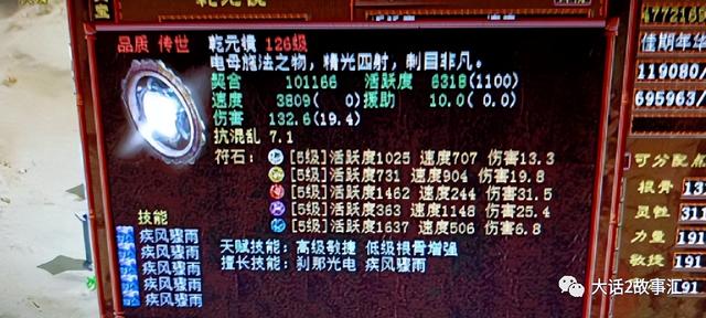 前几天小编给大家展示过许多满级的极品灵宝。今天这位玩家也想秀一下自己的灵宝,126级的乾元镜,契合10万,活跃度6318,速度3809,伤害132.6,大家觉得这个灵宝实战伤害能有多少呢?