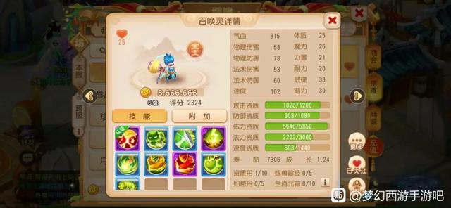 从技能搭配上来看,这只认证9技能召唤灵虽然还没有打书,但已经认证了上古灵符单法技能,后期成长空间非常大。此外,这只御风童子特有的内丹可以增加一定概率的物理闪避,其生存能力也得到了大幅提高。