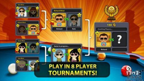 来自MiniClip的一款台球类竞技游戏,比较厉害的是可以多人进行对战,争夺最后的冠军,这类游戏算是比较少见。游戏采用的是美式普尔(8球)台球的规则。