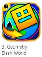 系列续作《几何冲刺世界》玩法上还是随着音乐节奏点击屏幕控制方块跳跃到达终点。然而这个版本把难度划分的更细了……一共5个难度等级,总有一个虐到你。在方块外观上也增加了很多新元素,相比于之前一个简单的小游戏来说,这个简直就是五脏俱全的小游戏啊!