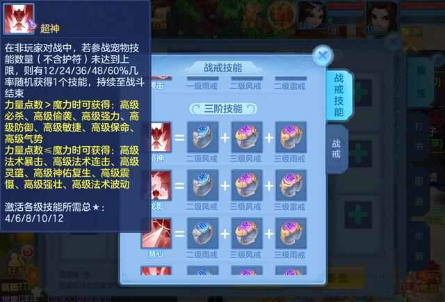 既然上文中我们已经说过了战戒带来的资质这一改变,这里就来说说战戒系统另一大作用——战戒技能。这类技能有着阶级之分,五阶战戒技能就需要8星才能触发,12星达到最强技能效果。这类技能的出现进一步加强了宠物的战术定位,同时生成的技能也涵盖了诸多使用场景。